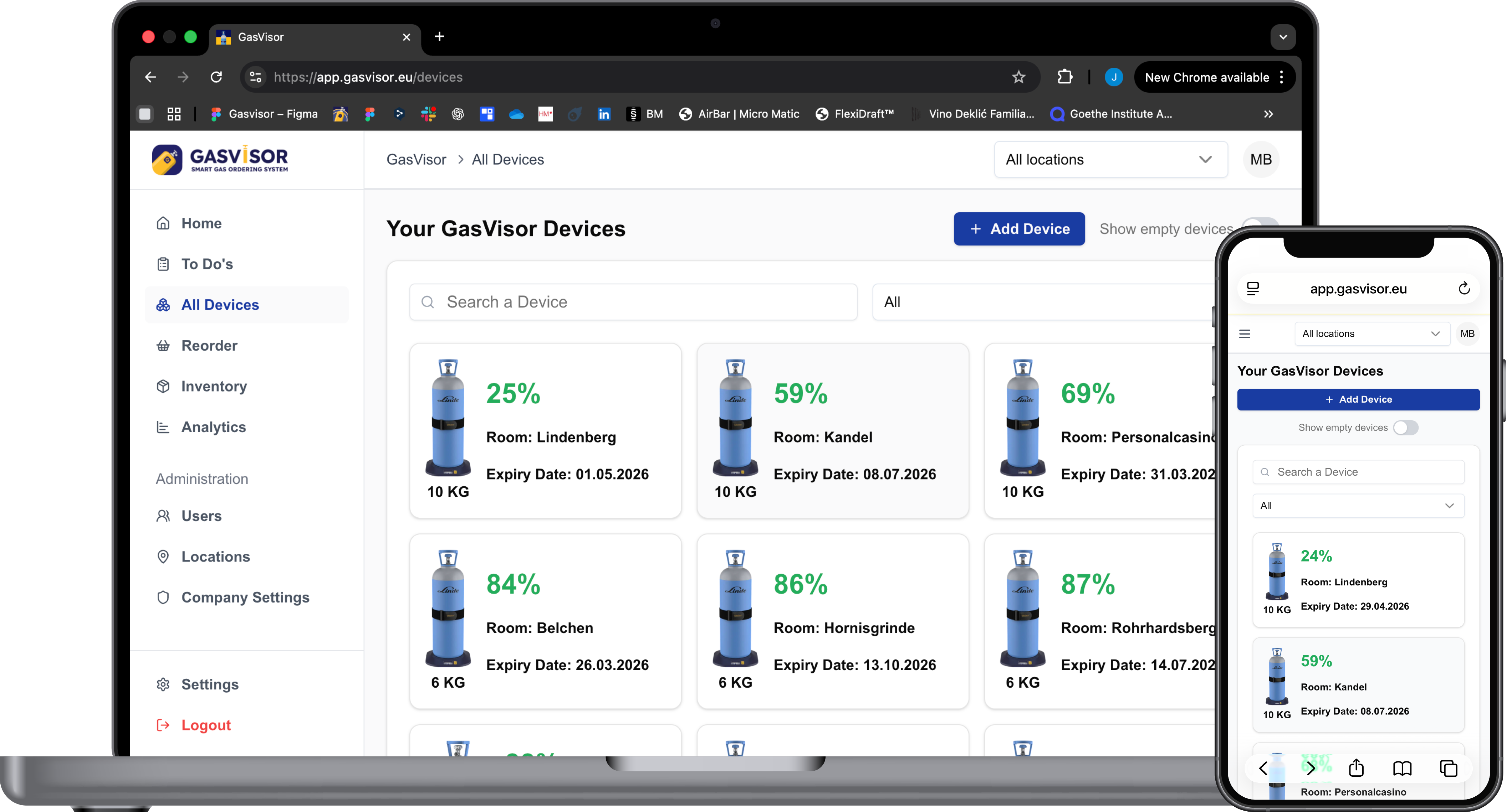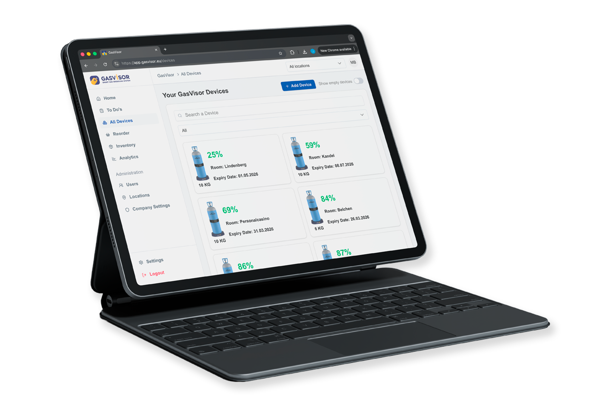 Its clean layout highlights what matters most — cylinder levels, consumption patterns, and task status — helping teams make quick, informed decisions and maintain smooth day‑to‑day workflows.